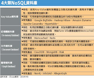 最後是雲端資料庫(Cloud Databases),雲端資料庫自然不用說了,它就是在雲端電腦上執行資料庫,但它是在這場演講中最重要的課題。NoSQL也被稱為Not Only SQL,是對不同於傳統的關聯式資料庫的資料庫管理系統的統稱。和SQL存在許多顯著的不同點,其中最重要的是NoSQL不使用SQL作為查詢語言。NoSQL在出來之前就已經出現很多種非關聯式資料庫,以下介紹4種比較受到關注的NoSQL資料庫,分別是Key-Value資料庫,記憶體資料庫(In-memory Database)、圖學資料庫(Graph Database)以及文件資料庫(Document Database)。
